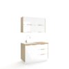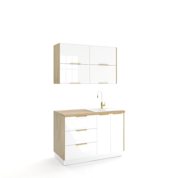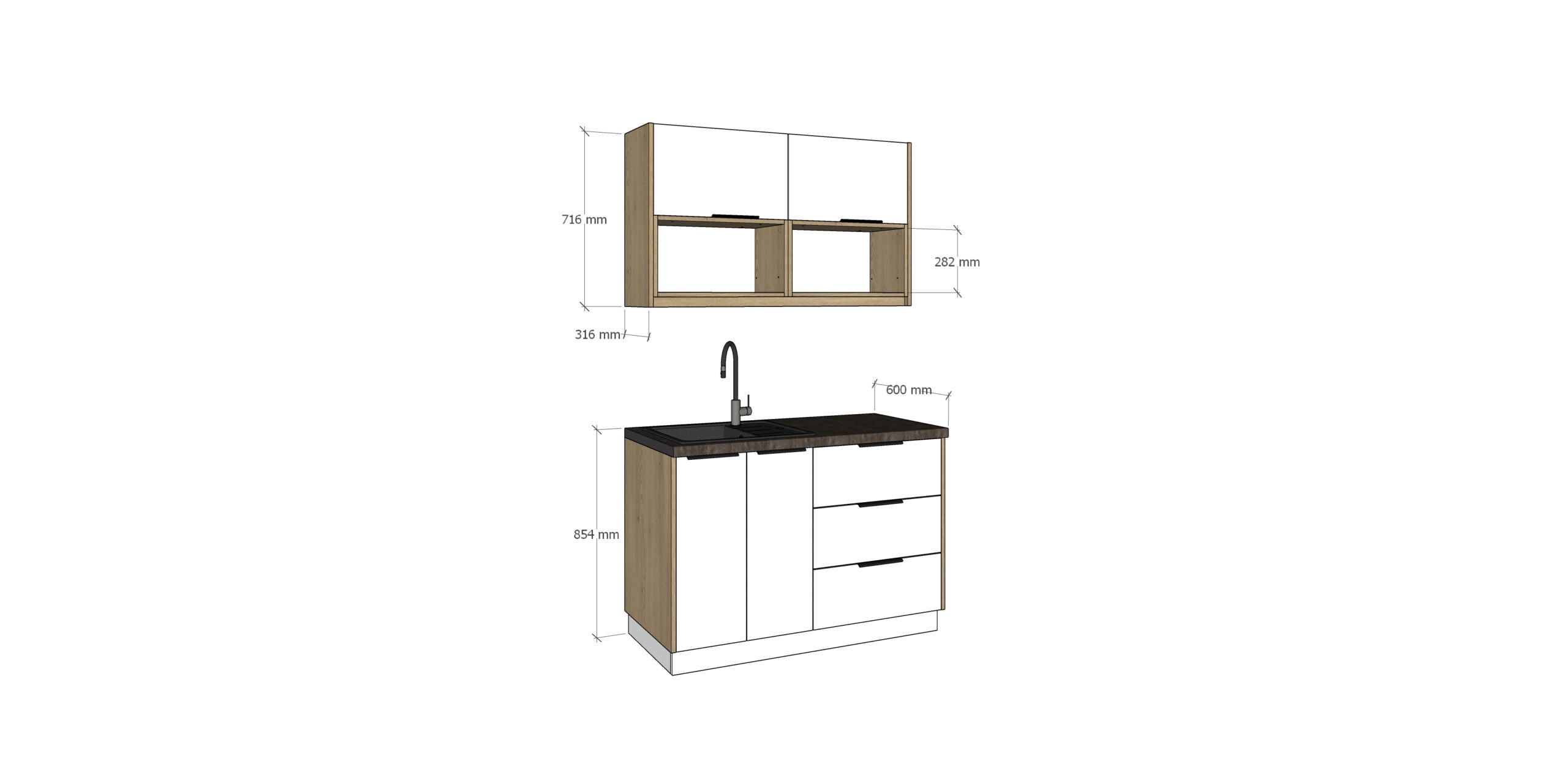 Dostępny w długościach od 120 do 160 cm, z opcjonalnym blatem ze zlewem i podświetleniem roboczym, łączy funkcjonalność mebla na wymiar z gotowością do natychmiastowego użycia.